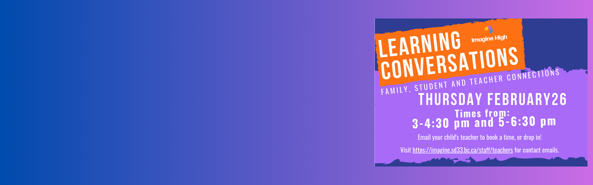 Imagine High is a full service public school of choice for grades 9-12 focused on Integrated art & technology through project-based learning. Students graduate with standard BC Dogwood Diploma. Learning moves through interdisciplinary projects with content from multiple subject areas. Out approach is rooted in the four pillars of Integrated Disciplines, Authentic Learning, Collaborative Culture & Visionary staff.